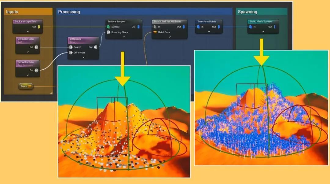 UE5.7裏,程序化內容生成框架(PCG)已經能把素材快速填充到遊戲中,無需任何代碼,只要在可視化編輯器裏按需調整好參數,就可以像撒豆子一樣把樹木、石頭均勻、隨機且合理地放置到場景中;