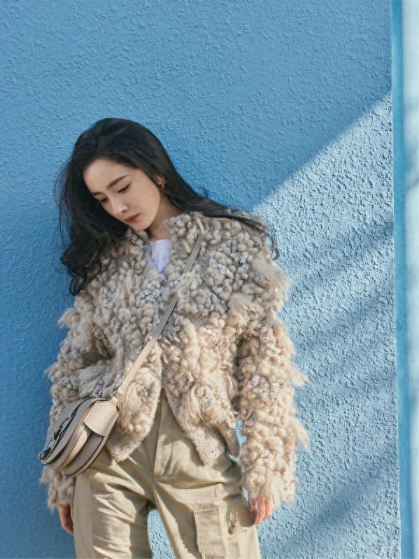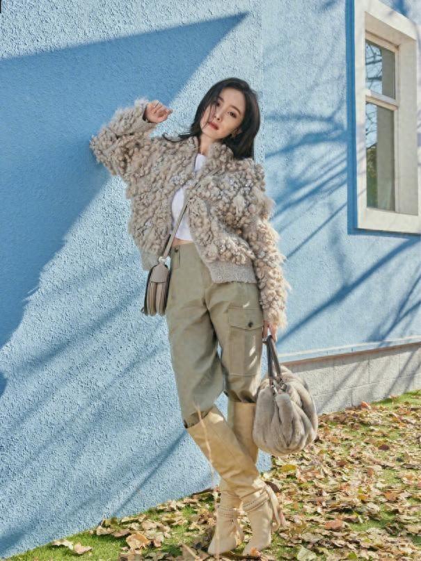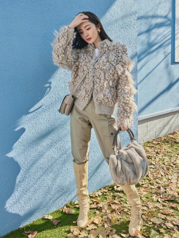 有時候真的不得不折服於楊冪的衣品。很難有人能夠將毛絨外套和工裝褲聯想到一起,而她甚至還意外搭出了高級感。將工裝褲的褲腿塞進卡其色的長靴當中,像這種色系相同的穿法,能夠擁有不費力的時髦感。