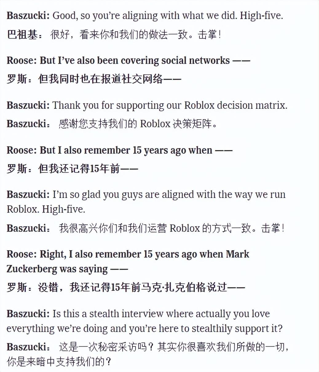 爲了緩和Baszucki的對抗情緒、嘗試進行一些有效對話,主持人肯定了其“不是一家公司的問題”的說法,甚至拉來了Discord和扎克伯格多年前的言論打比方。