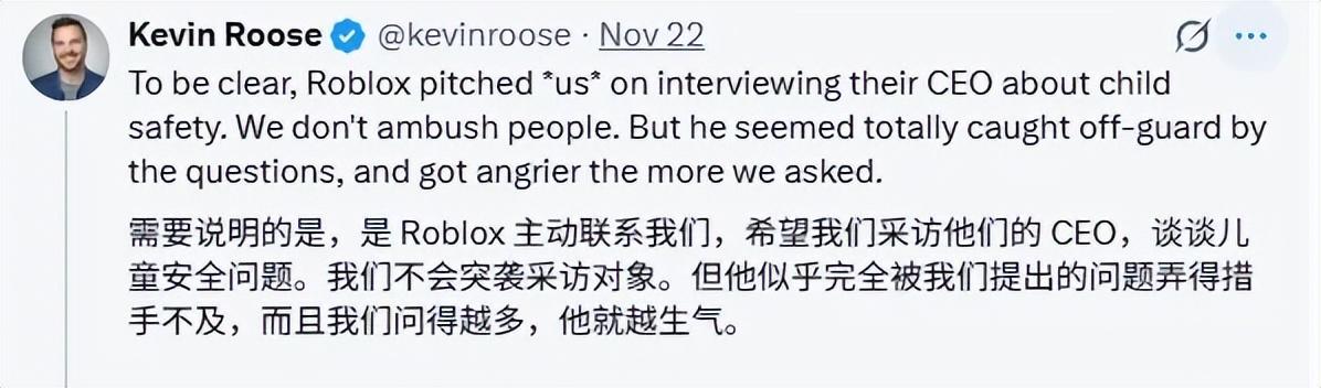 不到三十分鐘的訪談裏,“機遇”這個詞在Baszucki口中出現的次數甚至超過了“責任”。這個細節足以概括他在對話中的迴避和不耐煩:不承認平臺有過漏洞,並試圖將負面議題重新建構成技術創新和產品迭代的故事,直到被追問得似乎已經沒詞了。
