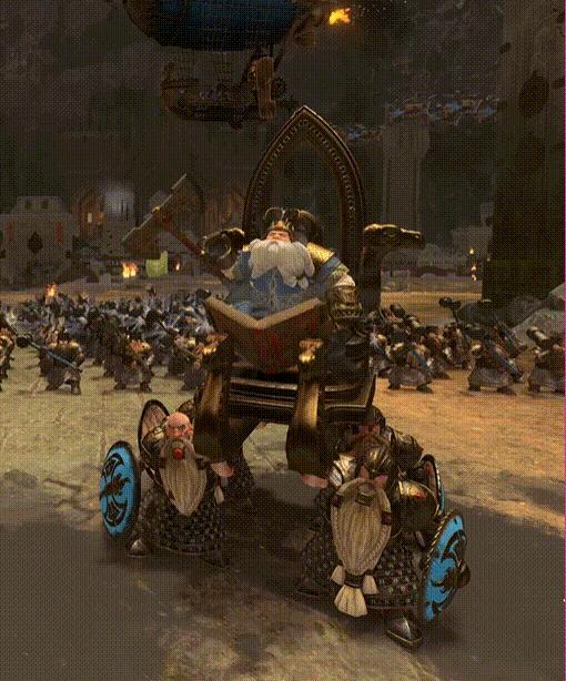 Scott:我印象最深的是《戰錘 1》中的 “至高王索爾格林”——一個由四名矮人抬着的王座單位。當時我擔心 “四個抬轎矮人 + 王座上的領主” 如何平衡數值和動畫,這可是四個獨立單位啊。結果美術團隊跟我說,別急,我們直接把整個單位做成了一個整體模型。但這麼一來,我們就不能複用已有步兵的動作,而要從頭製作整個抬轎動畫,的確不容易,但最後還是搞定了。