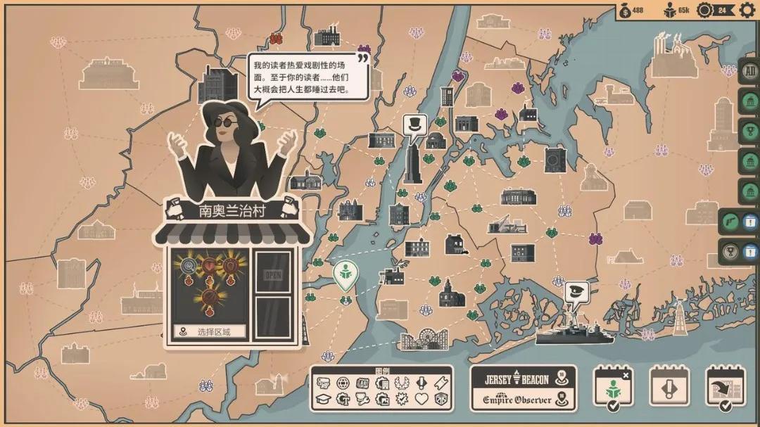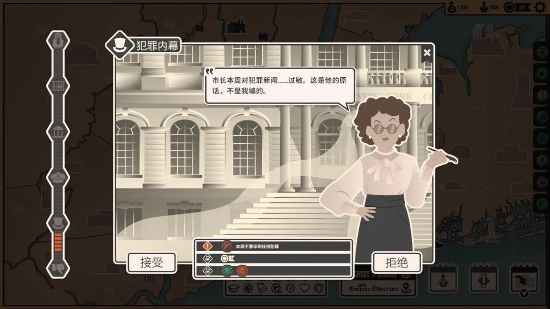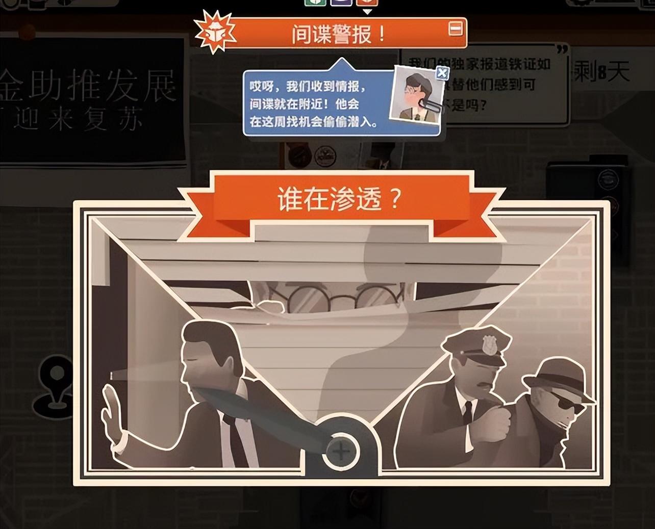 與此同時,遊戲裏塞滿了強勁的短期任務:玩家需要在黑手黨、政府、軍方和上層社會這四方互有齟齬的勢力中做出選擇、打點好關係;也需要在擴大市場時與競爭對手爭搶獨家報道,甚至需要放大界面,親手抓捕試圖混進報社偷走獨家報道的間諜。