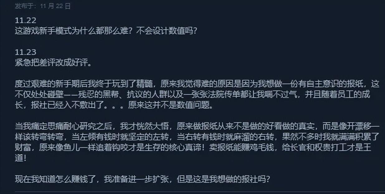 從模擬經營的角度看,這完全可以理解:畢竟強化反饋、明確目標和可控的結構,是這個品類的常規做法。但是作爲一款企圖致敬新聞黃金年代的遊戲,它可以做到的,或許還有更多。畢竟,在“新聞”這個超小衆題材裏,也確實有一些一些同類遊戲,試圖藉助機制去表達一些更復雜的敘事。