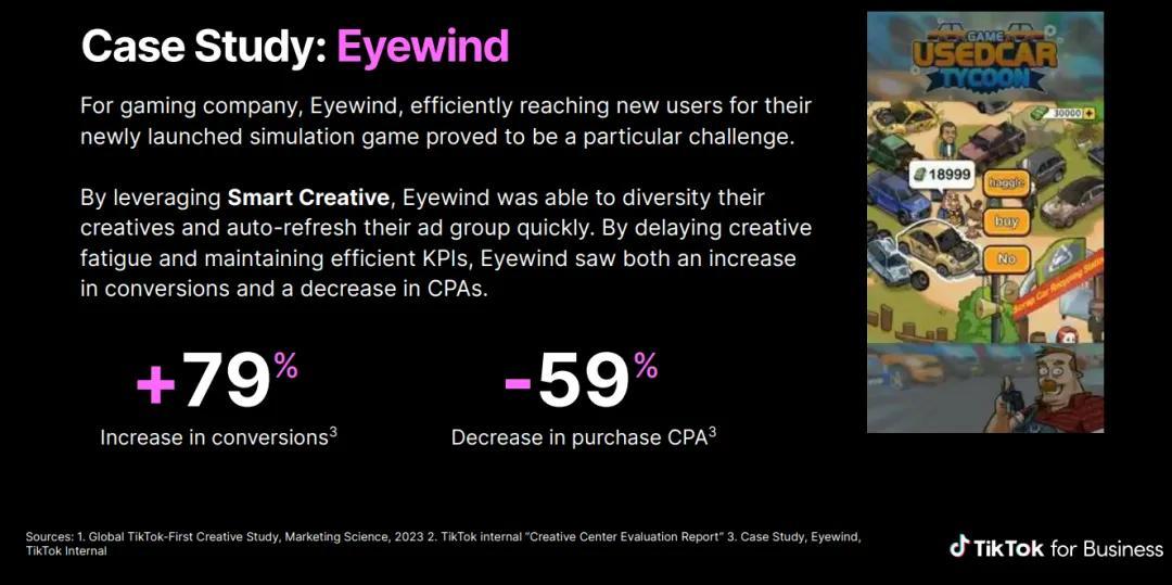 TikTok for Business就有個現成案例,在2023年的聖誕假期後,遊戲公司Eyewind曾給自家遊戲“舊車大亨”做宣傳。期間廣告的轉化率提升了79%,而費用降低了近60%,名副其實的“花小錢辦大事”。