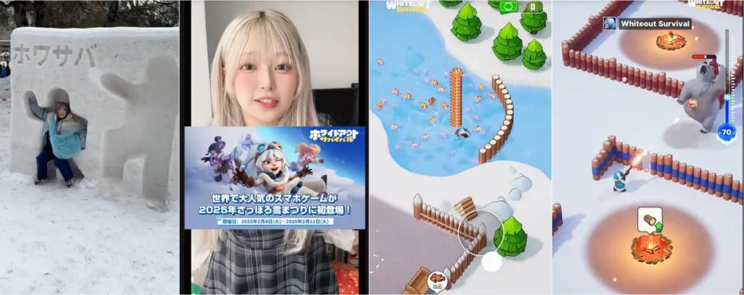 不過由於口味差異,在其他地區,往往要換一種玩法。尤其是同樣受Q5影響較大的日本市場,就是完全不同的畫風。比如《無盡冬日》的日區短視頻經常是小姐姐在打雪仗,或是真人抽象小短劇,只在一些鏡頭中出現遊戲的標題名或是logo。看來比起遊戲實機鏡頭,當地觀衆更青睞“真人出鏡”帶來的親切感。