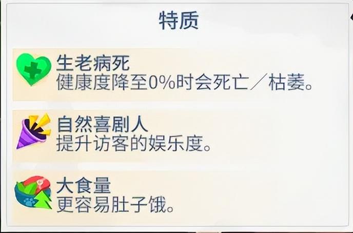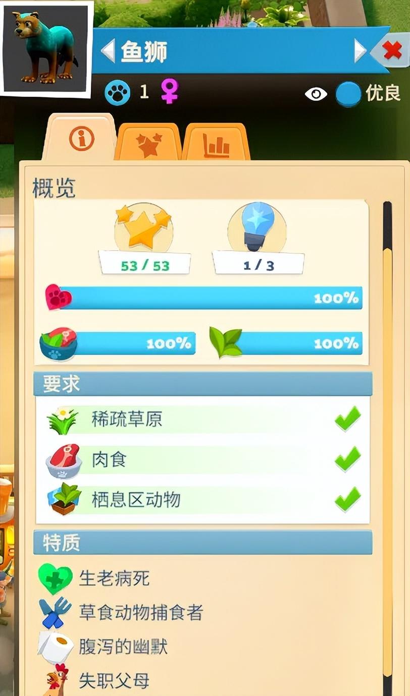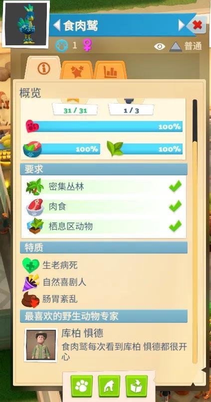 就像我抓到的第一隻“食肉鷲”,天生活潑開朗,擁有“自然喜劇人”特質,展出時可以自動爲附近的訪客提升娛樂值;但同樣的,它的體質不是很好,自帶另一種“腸胃紊亂”的負面屬性,喫不好拉不好,相當難伺候,需要僱傭的動物專家花費更長時間護理:
