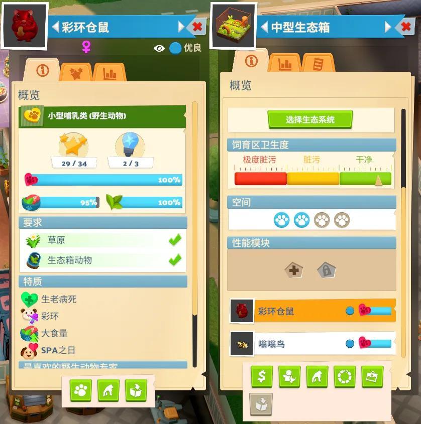 另外,豐富的動物屬性,也讓這次博物館的運營玩法更加講究策略性,也更考驗玩家的設計和部署能力。有些動物不願意和病號待在一起,有些動物會自己覓食無需人工投餵,還有些動物可能更喜歡和異性待在一起,這都是玩家在設計展區是需要考慮的點。