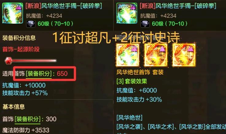 並不是說“超凡手鐲”本身屬性就一定好於“超凡上衣”,而是如果想湊齊首飾部位650積分“起源階段”的話,那麼就必須擁有「1征討超凡+2征討史詩」!