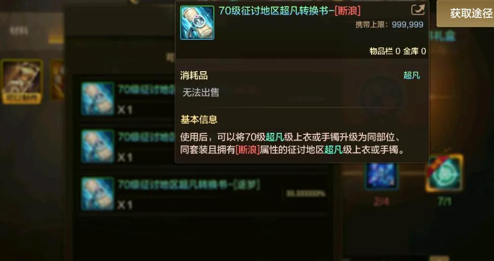“超凡轉換書”可以將普通超凡裝備,升級爲征討地下城的超凡裝備(帶詞條前綴)。
