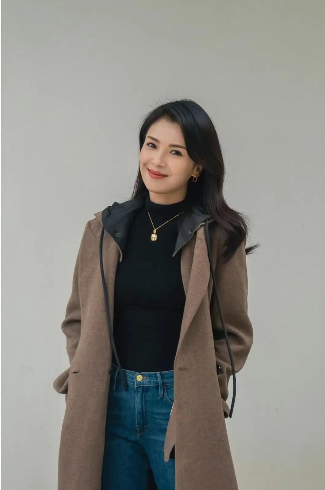 中年女人很適合穿棕色大衣,不僅能夠彰顯出成熟韻味,還能襯托出高級氣質。劉濤這一件連帽款的棕色大衣,風格上就比較休閒,內搭黑色修身打底衫和牛仔褲,輕鬆勾勒出身材曲線。