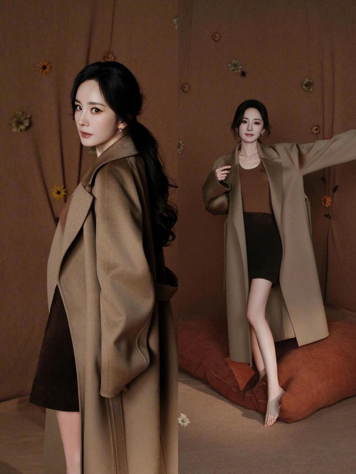 長款的棕色大衣,不一定非得配長褲、長裙,也可以通過短款下裝,玩轉“下衣失蹤”的穿法。比如楊冪身上穿的這條燈芯絨短褲,保暖又時髦,將大衣敞開穿的時候,瞬間秀出“筷子腿”。