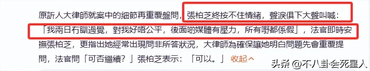 但對方律師並未放過盤問,反覆追問之下,張柏芝終於按捺不住情緒,聲淚俱下大喊:“我兩日未睡過覺,對我好不公平,外面的媒體有壓力,所有都是假的”。