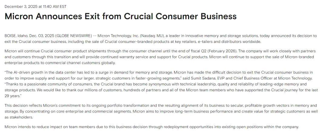 12 月 4 日,美光科技正式發佈聲明,旗下擁有 29 年曆史的消費級品牌 “英睿達(Crucial)” 將徹底退出市場。作爲全球第三大內存廠商,美光與三星、SK 海力士聯手壟斷了 92% 的全球內存市場,這次主動離場直接在消費級存儲市場撕開一道供應缺口,讓本就深陷漲價潮的 PC 玩家們雪上加霜。