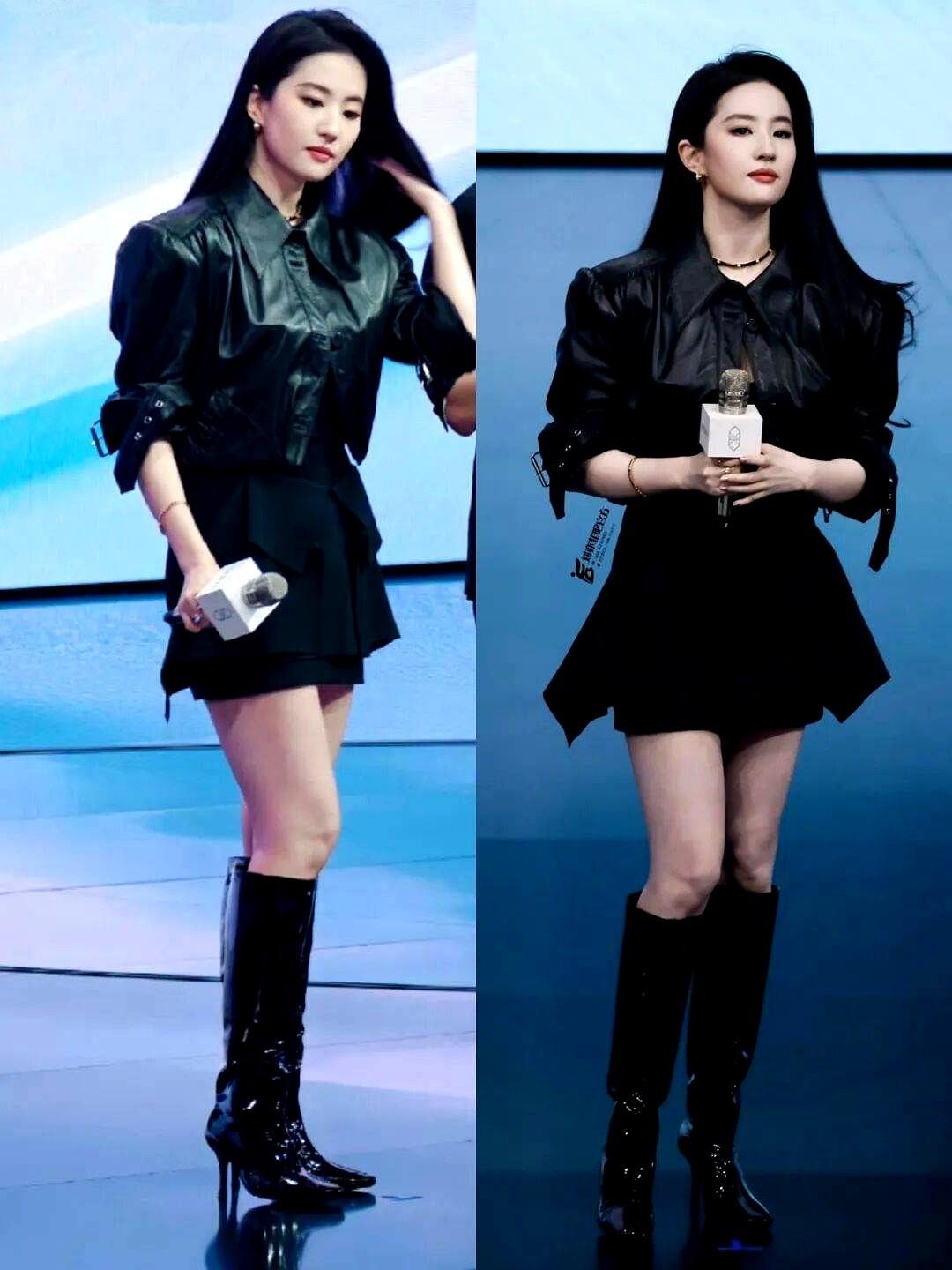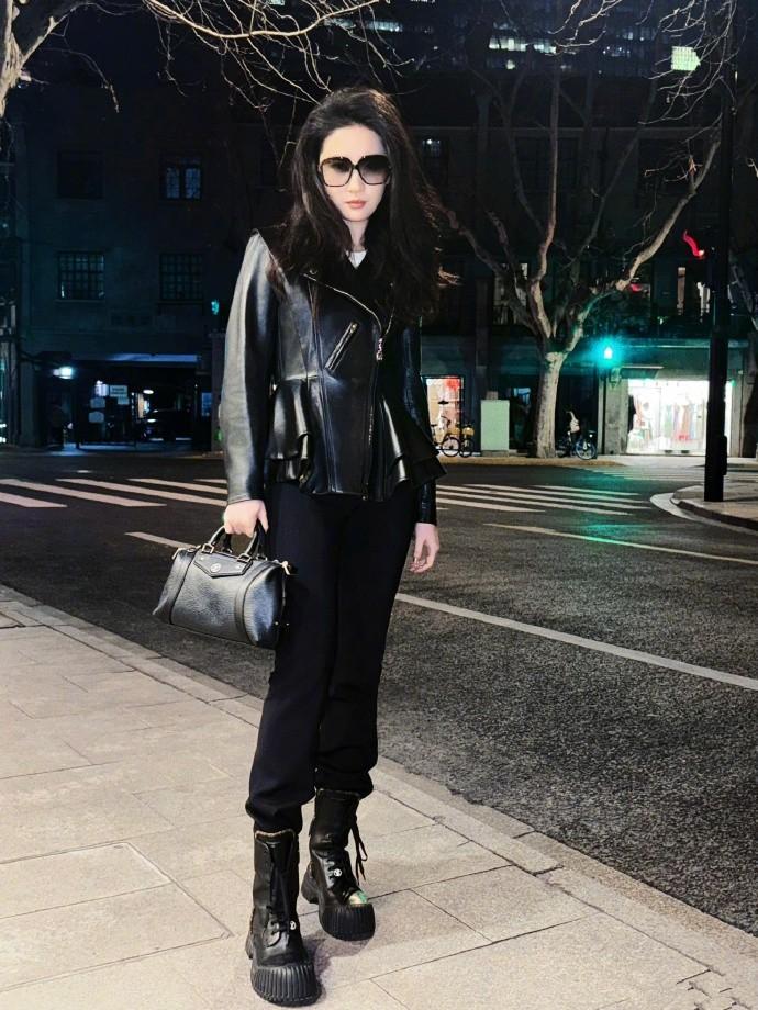穿黑色切忌不要太浮誇,一定要學會“做減法”。比如裁剪設計越簡約,越能夠藏匿住身材上的短板,色彩數量越少,又不容易出岔子。看劉亦菲這一套穿搭就知道了,黑色收腰皮衣配束腳褲,用材質突出層次感,纔不會顯得突兀。