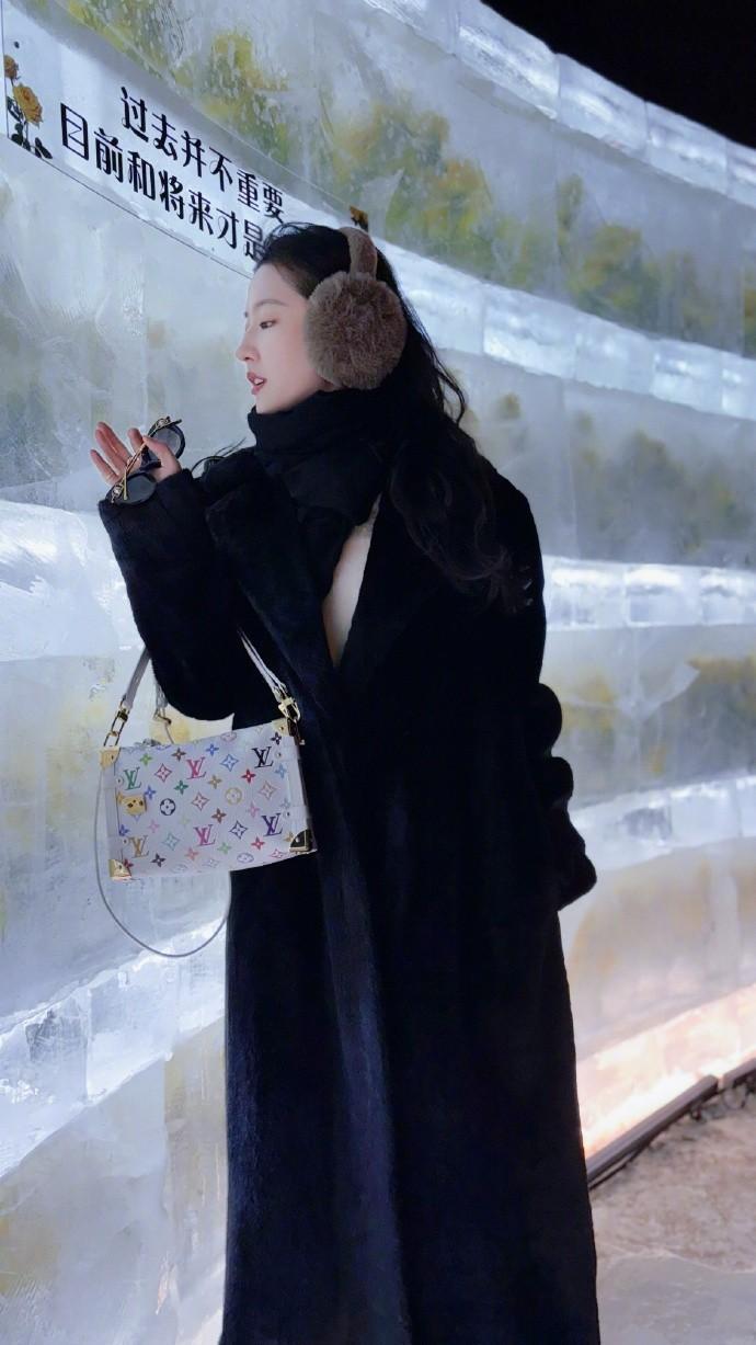 衣服基礎,配飾就不基礎。身穿黑色大衣的劉亦菲,拎着一款白底彩色logo的品牌包包,既可以挎在手上,也可以背在肩膀上,一包兩用,瞬間就突出了造型亮點,擺脫了沉寂感。