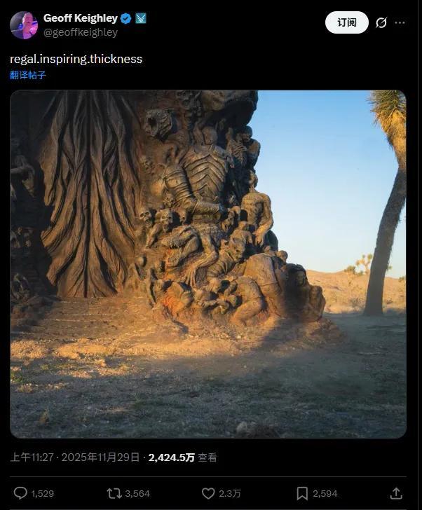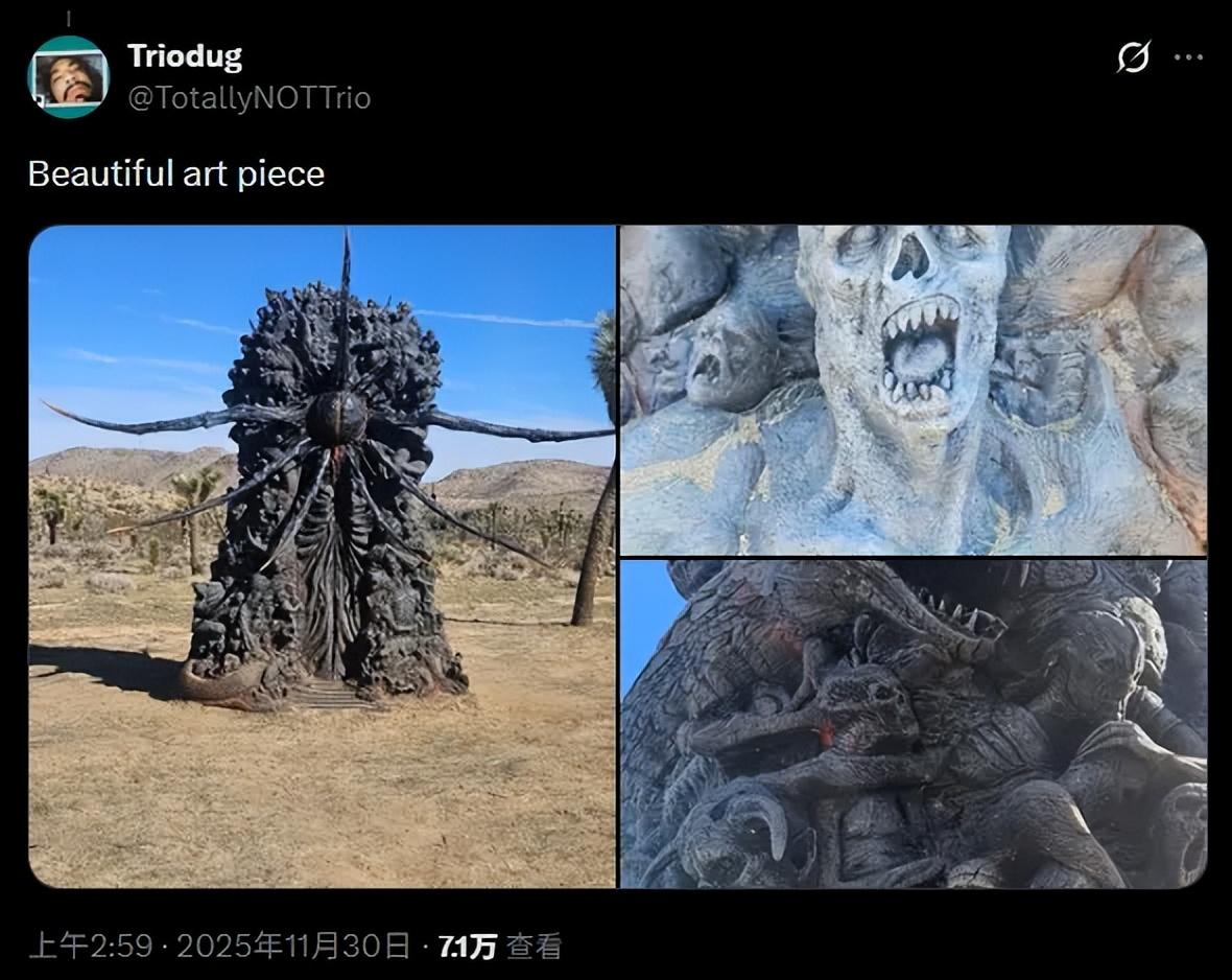 有玩家將這串字符破解,發現它指向美國加州莫哈維沙漠的一處地標,且與TGA官方隨後發佈的谷歌地圖定位完全一致,許多玩家奔赴現場,果然看到了一座混合着骷髏、火焰、蜥蜴人等各種元素的巨大雕像。