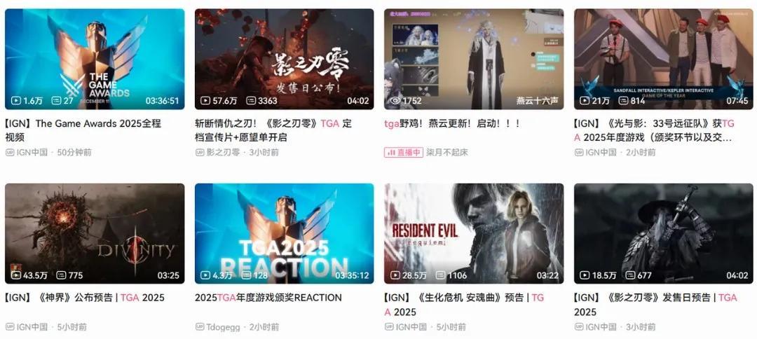 不過,與往年的TGA頒獎典禮的熱烈氛圍相比,今年圍繞年度遊戲《33號遠征隊》的討論無論如何都顯得有些平淡——若是在B站搜索“TGA”等關鍵詞,你會發現,比《33號遠征隊》頒獎典禮和獲獎感言播放量更高的,反而是其他新遊戲的宣傳播片。