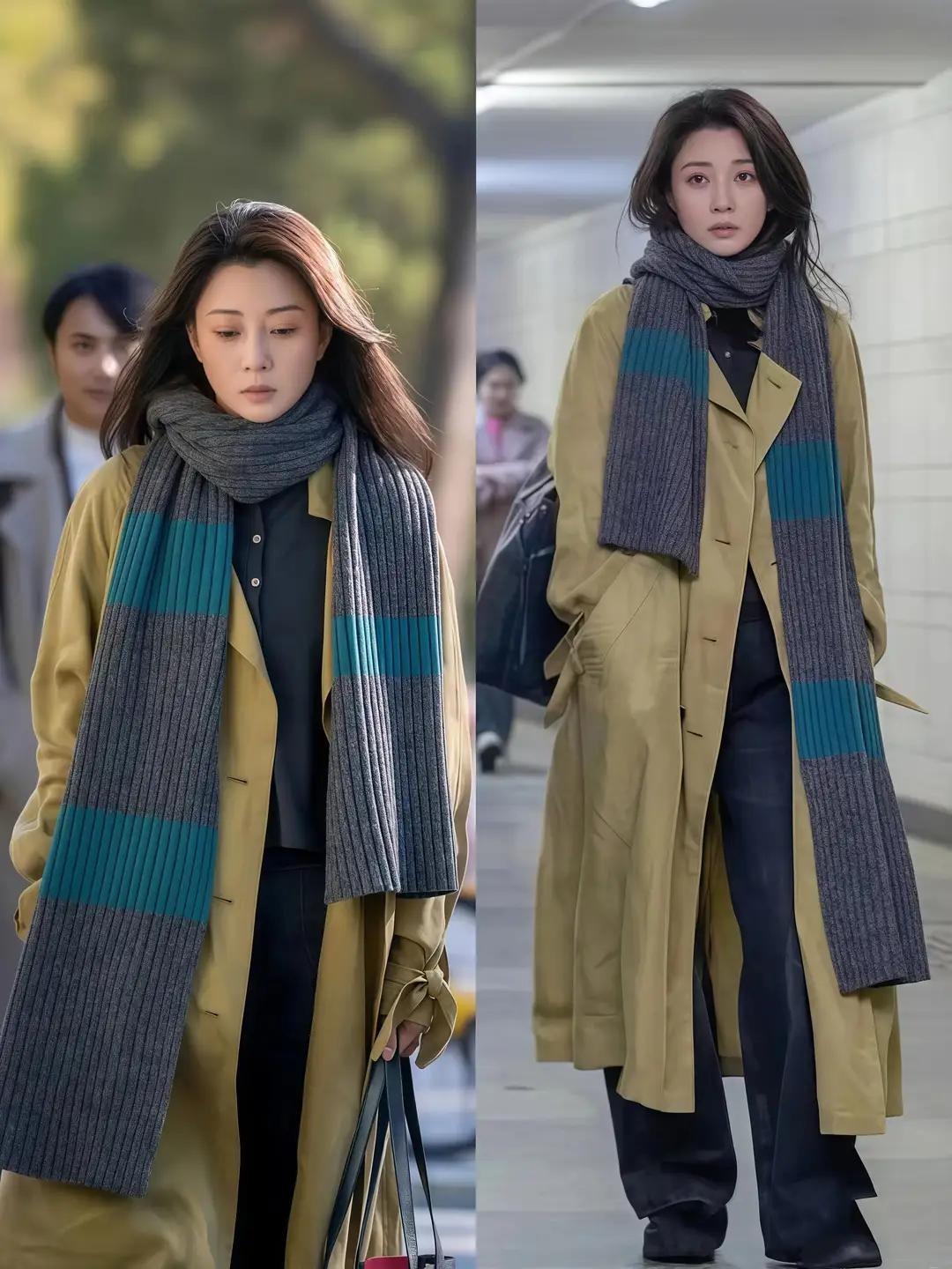 中年女人真的很適合穿大衣。殷桃這一件卡其色的長款大衣,輕鬆穿出了好氣質。內搭深色修身打底衫,繫條灰色針織圍巾,一頭長卷發,營造出超絕的氛圍感,顯得慵懶又不失高級感。