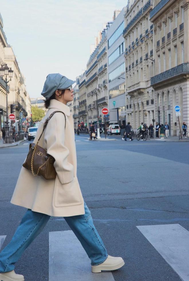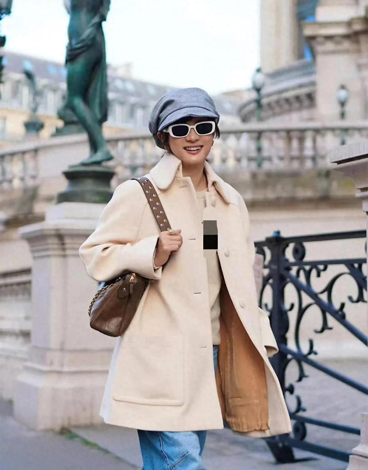 不得不說,孫儷的衣品真是越來越好了。像這種基礎款的白大衣,搭配經典款的牛仔闊腿褲,利落又隨性。鞋子帶點厚度,顏色和大衣呼應,時尚感瞬間拉滿,尤其是配飾的點綴,巧妙的提升了精緻分。