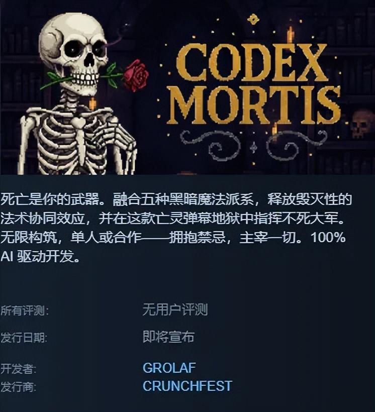 12月10日,由國外遊戲作者Crunch Fest“開發”的新遊戲《CODEX MORTIS》,正式在Steam平臺上線了商店頁面,它的特殊之處在於遊戲介紹的最後一句——“100%AI 驅動開發。”