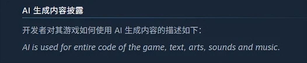 如今在Steam上發佈的中小型獨立遊戲,已經可以越來越頻繁的看到開發者在遊戲簡介的最後補上一行諸如“部分美術/音樂資產由AI生成”的小字,但對於這款遊戲來說,作者做得要更徹底,因爲它的介紹是這麼說的: