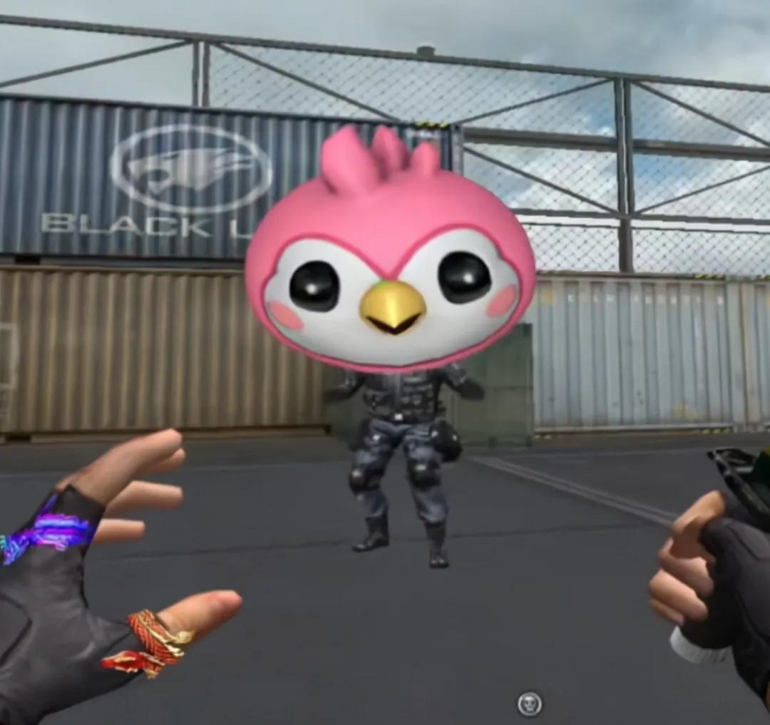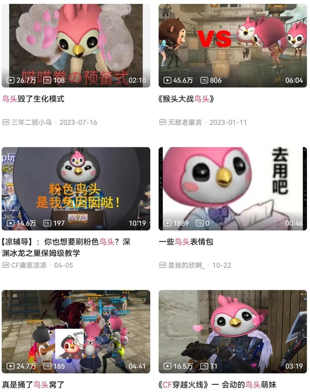 一開始,鳥頭在玩家間還在和另一款“猴頭”頭套進行競爭。但很快,鳥頭就因爲更加呆萌無辜的表情和動態效果,靠着反差感在玩家間迅速躥紅,成爲CF玩家抒發心情的表情包,也成了二創的一大載體。