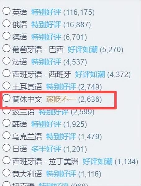 正是這個看似互相沖突的設計,形成了這款遊戲獨特的環境和玩家社區。對於國內玩家來說,印象較深的一點就是遊戲的“環大陸好評”,截止目前,24個語言區域裏依舊只有簡體中文是“褒貶不一”: