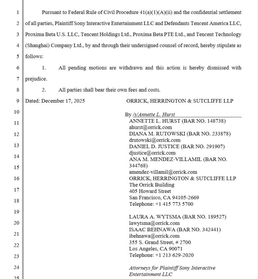 剛剛,據外媒The Verge援引最新提交的法院文件顯示,索尼與騰訊已就相關爭議達成一項保密和解,案件被有偏見駁回(dismissed with prejudice),這意味着雙方將不再就同一爭議重新提起訴訟,也不會就此事發表進一步的公開評論。