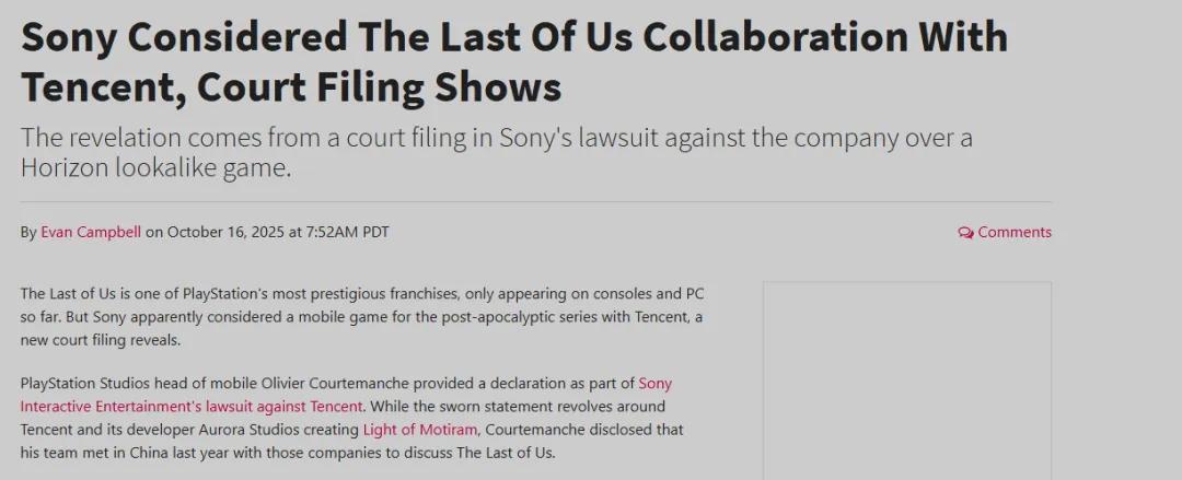 同年7月,外媒報道索尼移動部門主管親訪騰訊,探討《最後生還者》手遊在內的諸多合作可能。