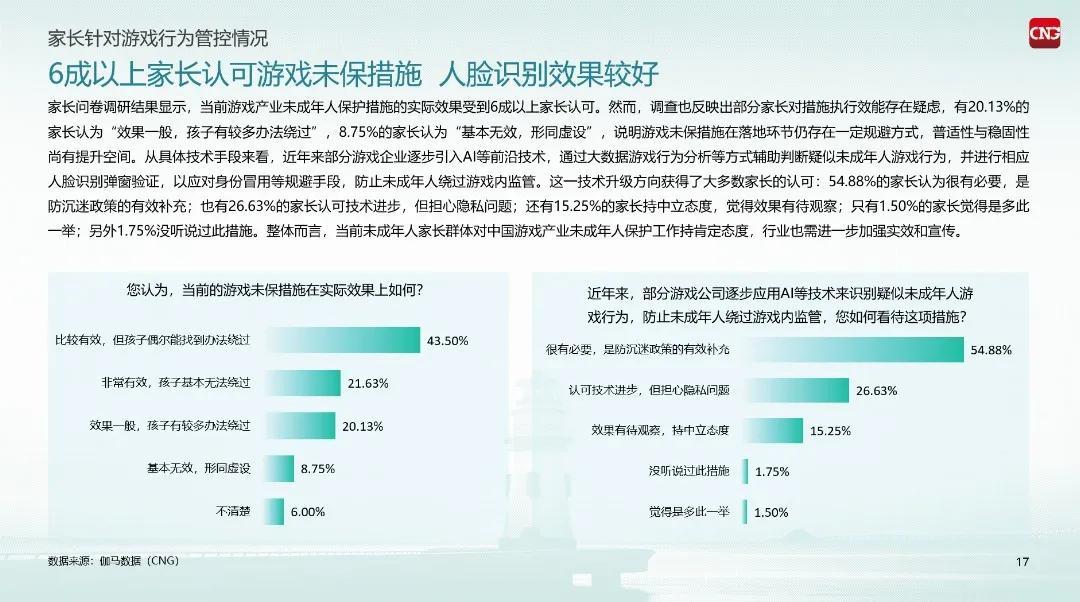 而從這次工委發佈的報告來看,遊戲廠商的思路並非自說自話。調研數據顯示,超過六成家長對當前遊戲行業的未成年人保護措施給予了明確認可,其中,認爲“人臉識別等技術手段是防沉迷有效補充”的家長比例超過一半;即便在持保留態度的家長中,更多擔憂的也是隱私和使用體驗,而非對措施本身的否定。