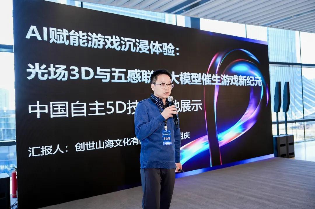 在“中國自主3D技術落地展示”環節,創世山海文化公司董事長張明慶帶來了由該公司自主研發的國產5D技術落地演示。