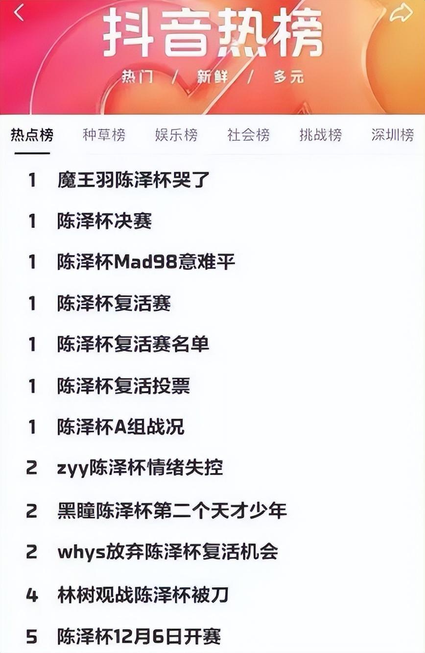 然而,根據抖音給出的統計,陳澤杯的相關話題共計21次登上抖音熱搜,7次佔據榜單第一,比賽最高同時觀看人數一度突破211萬。