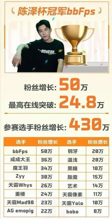 除了百萬獎金以外,這次比賽後bbfps漲粉超50萬,對於他的生活和事業來說,陳澤杯已經可以算是很重大的一個節點,除此以外,陳澤本人自己漲粉累計400萬,參賽選手們也共計漲粉430萬。