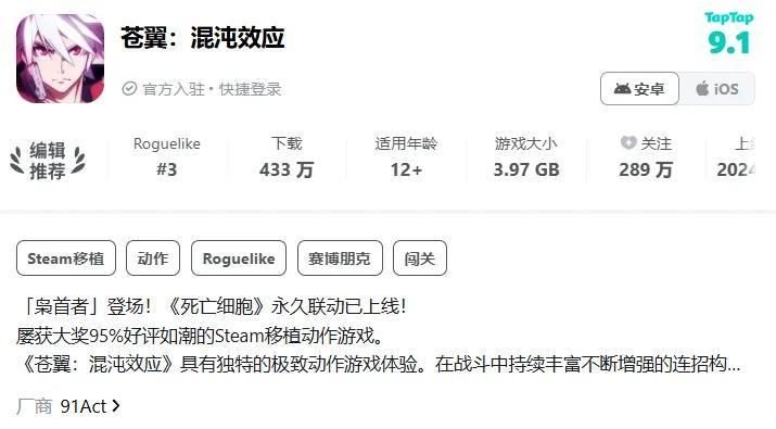 《蒼翼:混沌效應》在TapTap有着433萬下載