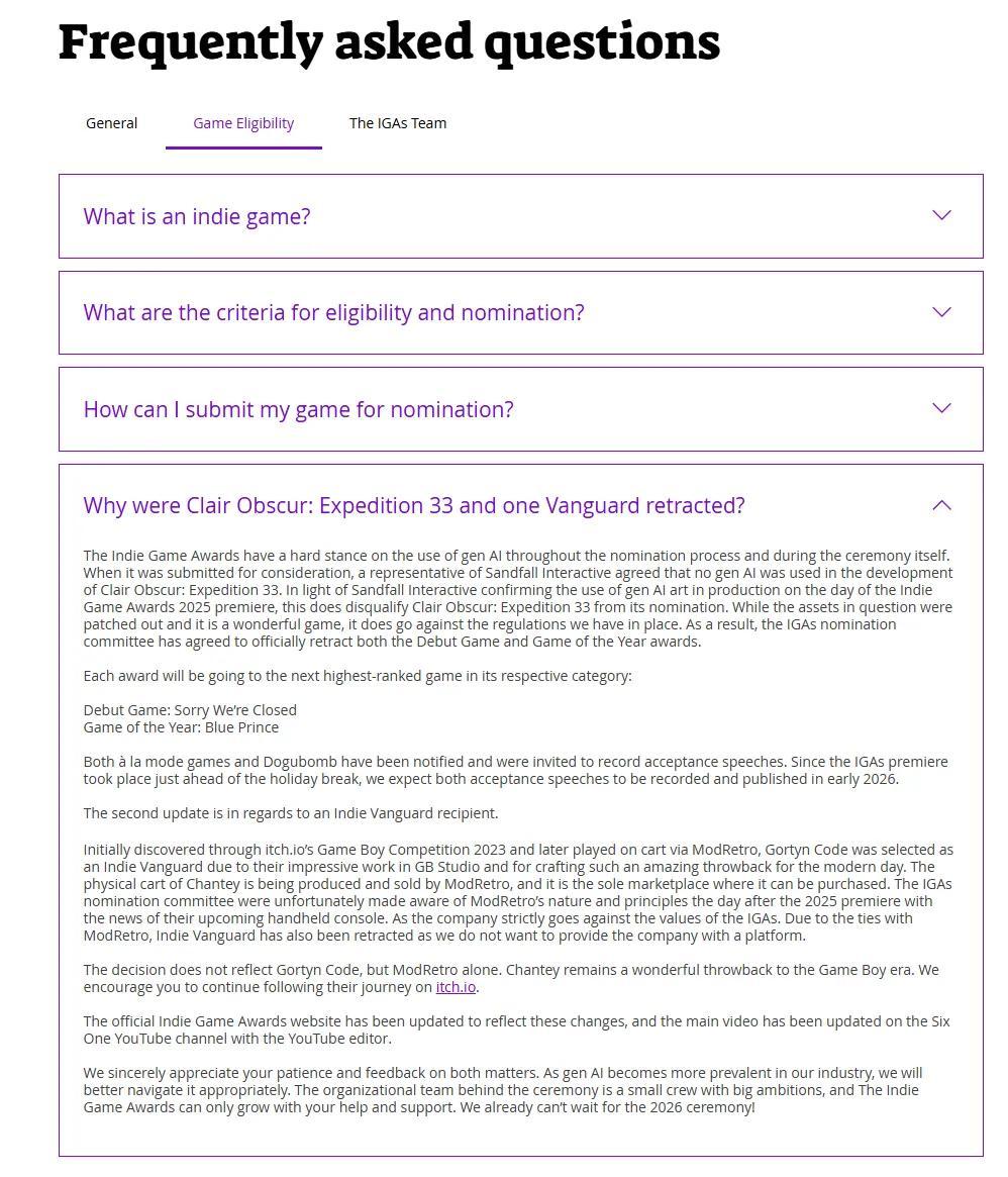 但就在昨天,The Indie Game Awards官方突然宣佈撤回原本已經頒給《33號遠征隊》的兩大獎項,但原因倒不是因爲它“獨立遊戲”的定義之爭,而是被證實在開發過程中使用了“生成式AI”。