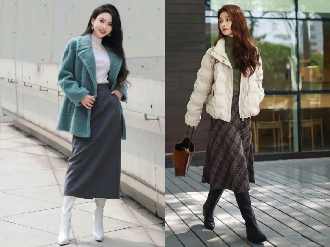 線條感筆直流暢的筒裙,能夠隱藏住身材上的瑕疵。配上貼合度高的尖頭低跟長靴,將厚實一點的外套敞開穿,內搭扎進裙腰,顯瘦又顯高。靴子可以和內搭同色,形成“上下呼應”的效果。