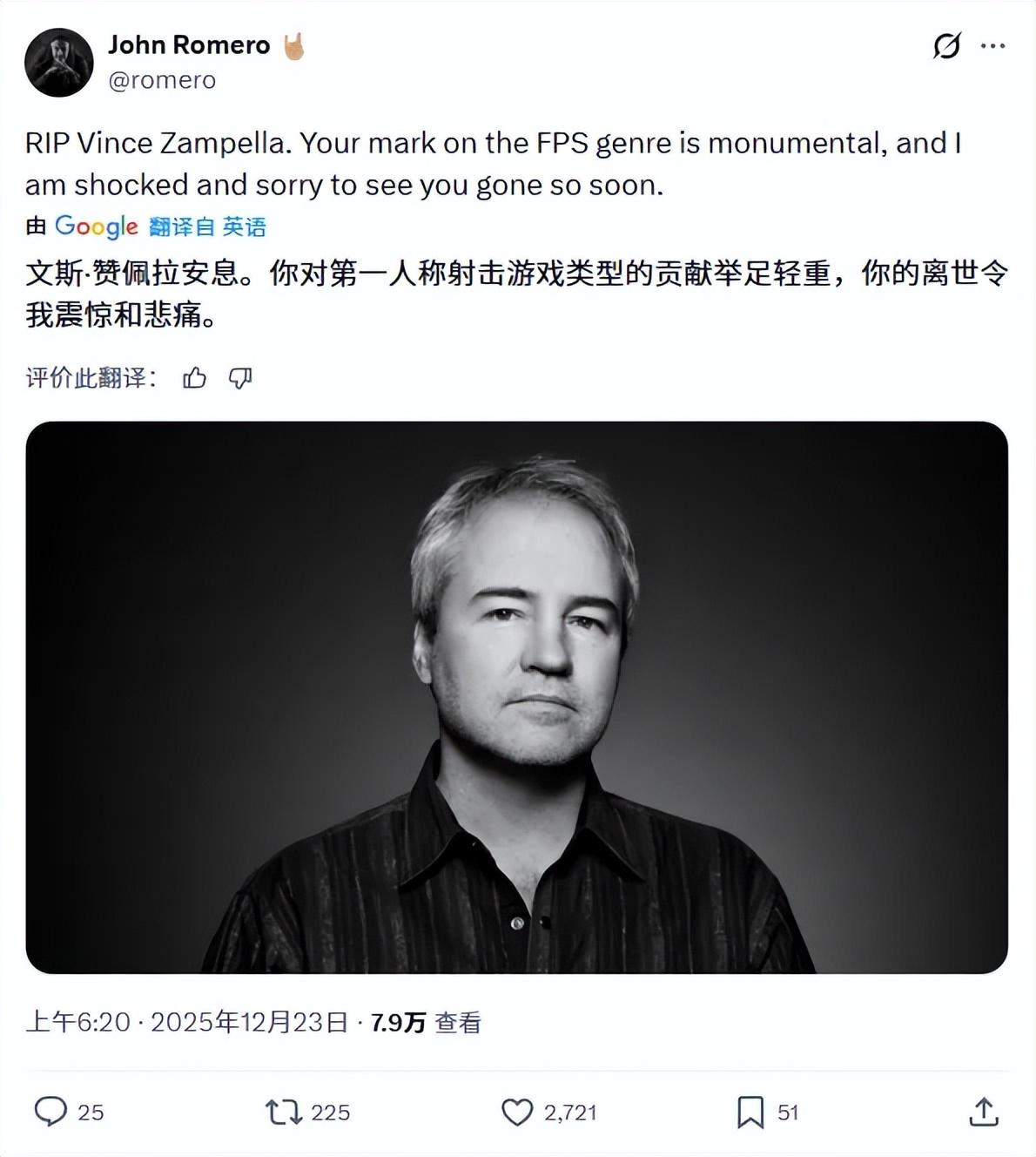 彷彿仍然處在事業上升期的文斯突然去世,這一消息難免激起業界的巨大反應。包括重生工作室、戰地風雲工作室、負責《使命召喚》的IW和Treyarch工作室,乃至開發過FPS開山之作《德軍總部3D》、真正意義上的“FPS之父”約翰·羅梅洛,都在第一時間發推悼念。