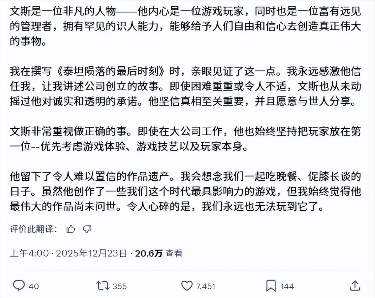 將來的遊戲行業不會缺少前赴後繼的開發者和FPS新作,有生之年玩到《泰坦隕落3》也並非不可能。但今天的遊戲行業失去了文斯這座讓“槍車球”中的“槍”屹立25年不倒的大山,這很可能意味着屬於FPS遊戲的、一個時代的終結。