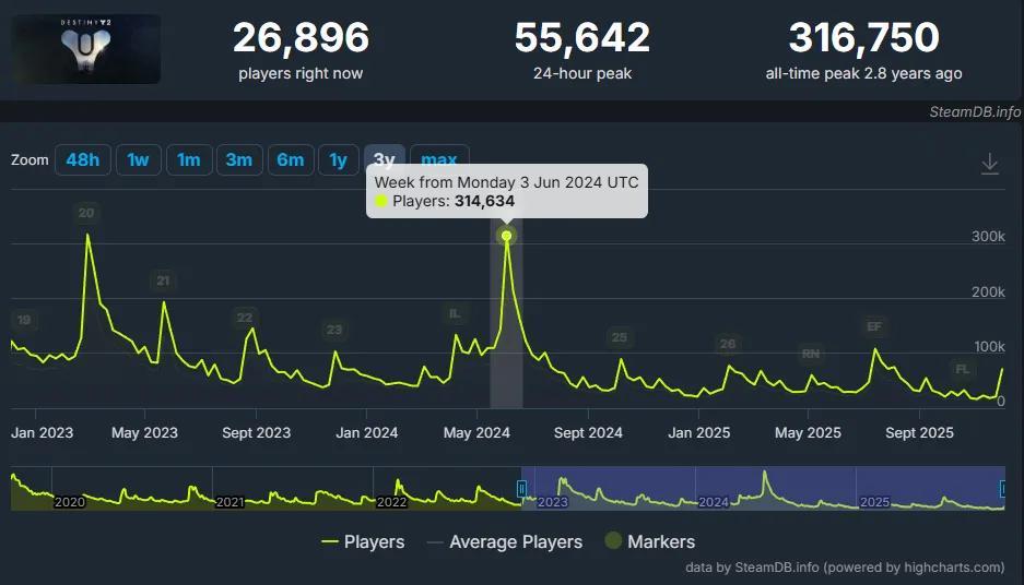 而更殘酷的是,哪怕站在“贏家”行列裏,也未必能一直笑下去。索尼旗下的Bungie,打造了幾乎堪稱歐美3A遊戲工業的GaaS化標杆的《命運2》,但其年八更新“預言之年”卻成了系列最低谷,迎來了系列歷史上最劇烈的斷崖式下滑。