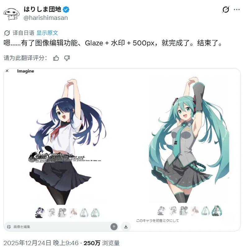 例如在X上,有位畫師剛發佈了一份給粉絲的作品,結果這兩天評論區就有了AI改圖,AI順便輕易抹除了作者的水印、簽名,不難想像,大部分創作者面對這樣的行爲根本無力反抗。