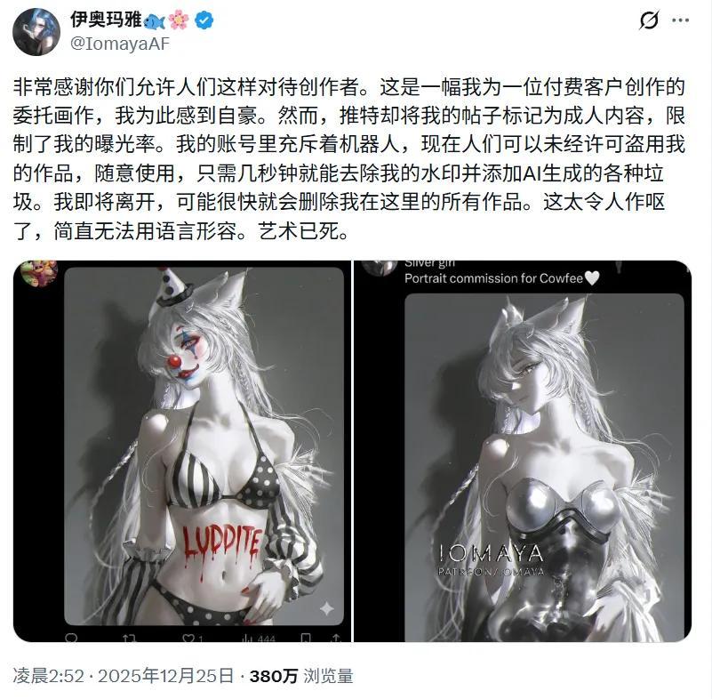 生成式AI普及以來,擅自使用他人作品訓練AI,或是用AI二次修改作品等,無疑是所有創作者最深惡痛絕的事,之前這事創作者們早已是有苦說不出,但在明面上只要沒有太過火平日也還算相安無事,不成想X這次直接“貼臉開大”。