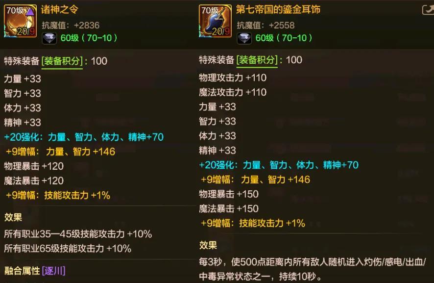 “諸神耳環”增加35~45和65技能10%攻擊力;“帝國耳環”則增加110三攻和150點暴擊。