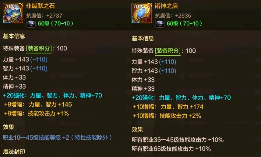 而“諸神魔法石”和“諸神耳環”的屬性就一樣了,都是增加35~45和65技能10%技攻,屬於鎮魂曲的標配強散!