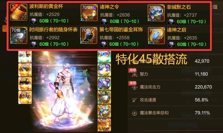 好了結論也就出來了,以“鎮魂曲”爲核心的特化45散搭流推薦搭配:黃金盃/懷錶左槽+諸神耳環+非緘默之石/諸神魔法石!