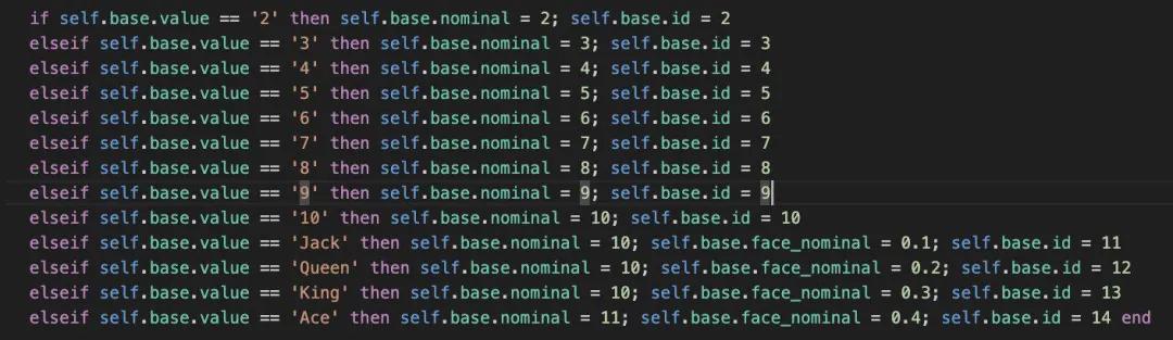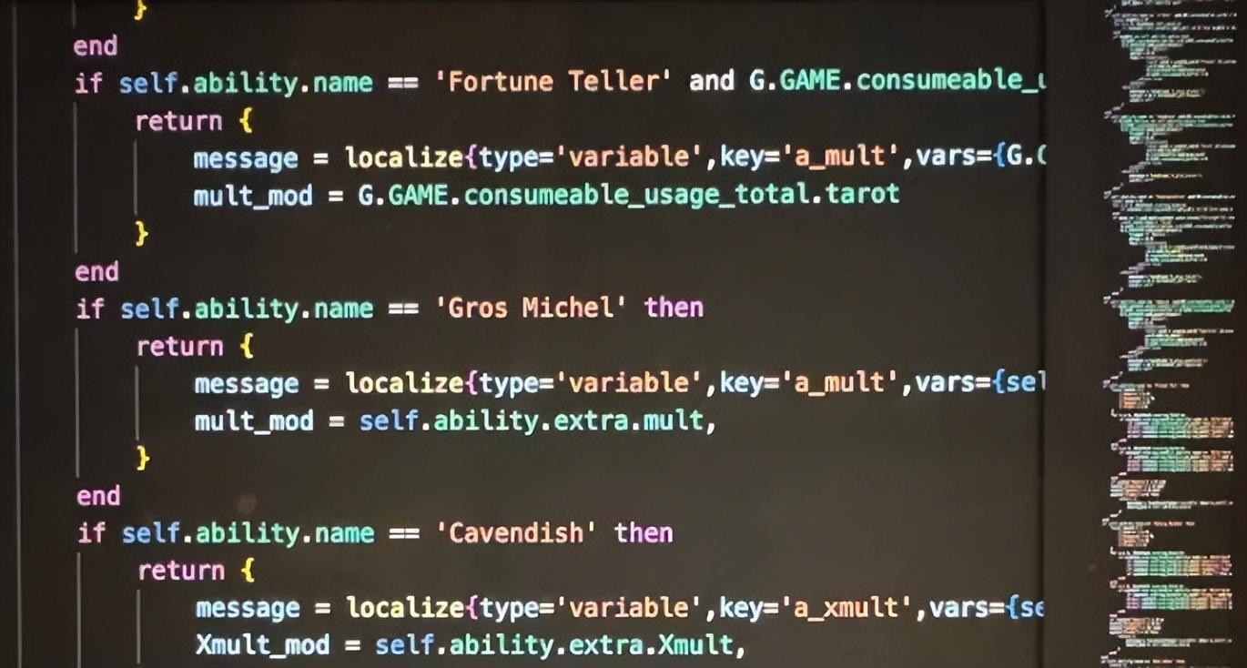 2024年的《小丑牌》拿獎拿到手軟,儼然被行業視爲風向標,但其遊戲代碼卻遠不如遊戲設計那麼優美,許多複雜的遊戲邏輯,如不同小丑牌的效果疊加、分數計算,都是直接用大量的、嵌套的if-else語句堆砌而成,導致代碼看起來原始且重複。