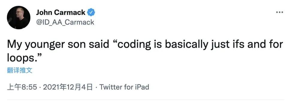 知名程序員、id Software創始人之一約翰·卡馬克曾舉證:“我兒子說‘寫代碼不過是if、else和for循環而已’”