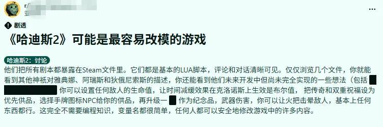 樂趣在於,《哈迪斯2》的大量核心邏輯、技能數值和關卡流程都是用Lua腳本編寫的,這些文件直接以純文本形式存在於遊戲目錄中,可讀性很高,任何玩家都可以輕鬆閱讀、理解。