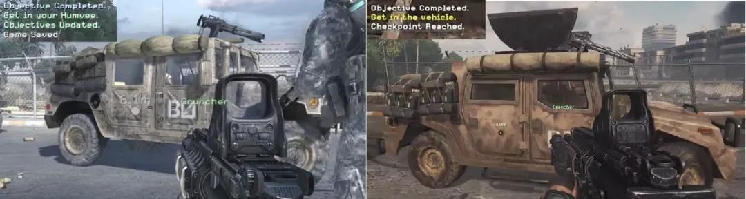 MW2重製版(右)和原版(左)相比,車輛造型經過了調整,任務提示也將“悍馬”一詞改成了“載具”