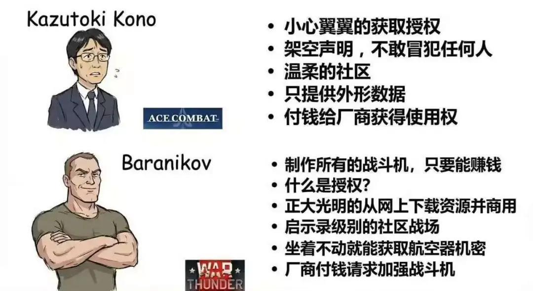 這大概只能說是一種文化差異了——《皇牌空戰》將“獲取授權”視爲基本項,而《戰爭雷霆》看起來是將這作爲“加分項”了。