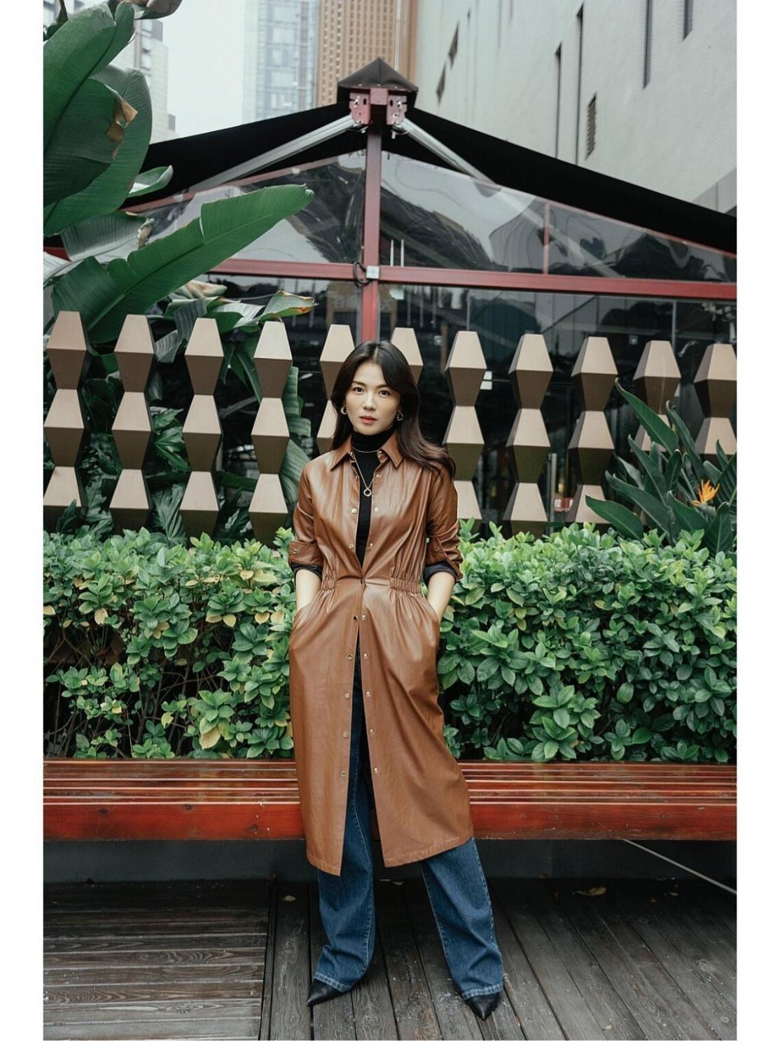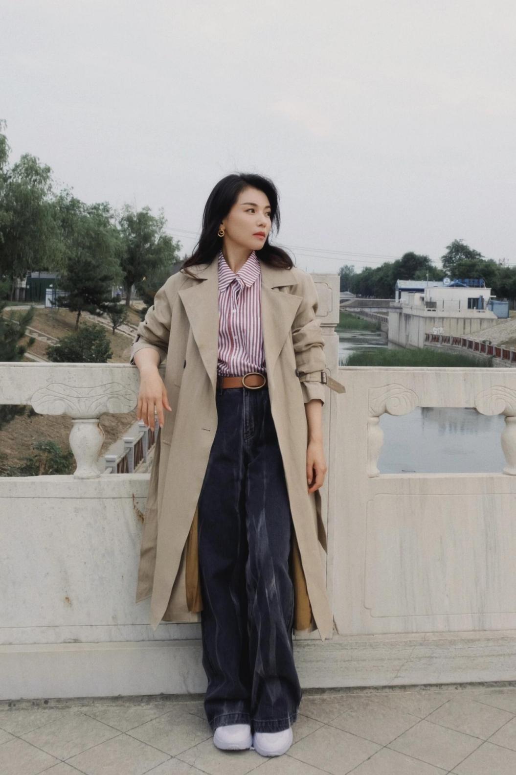 經典的卡其色大衣,適配度極高,一到冬天就特別受歡迎。但想要穿的出彩,建議可以學習劉濤這樣,在裏面疊穿紅白條紋襯衫,下半身配條扎染式的高腰闊腿褲,再系根棕色寬腰帶,視覺上便可以拉長下身比例。